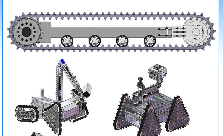 Rubber robot track belts: This is a rubber track belts molded as a single piece, unlike traditional chain-type tracks drive mechanism one can directly make use of chain links together to have two belts. These rubber robot track belts are used to manufacture small-scale climbing tracks, which are more cost-effective than traditional chains and offer greater flexibility. Their operating principle is identical to that of chain tracks. can then be mounted on four wheels driven by only two driving motors. Chains can be connected together using connecting rods.But rubber robot track belts is a single-piece construction, requiring no connecting rods.